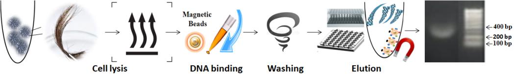 DNA提取是發(fā)干法醫(yī)分析的第一步。在一根無(wú)根毛發(fā)中只能提取出皮克級(jí)別的超短DNA片段。由于實(shí)際問(wèn)題和技術(shù)原因,使用不同的提取方法,優(yōu)化條件從不同樣品中,最大程度的提高收集DNA的產(chǎn)量和純度至關(guān)重要。因此,尋找一種高效、穩(wěn)定和簡(jiǎn)單的提取DNA和擴(kuò)增nuDNA靶點(diǎn)的技術(shù)是毛干DNA提取和擴(kuò)增的主要挑戰(zhàn)。因此,研發(fā)出一種從發(fā)干中提取DNA并且能去除DNA污染的簡(jiǎn)單方法,同時(shí)可以顯著縮短分析時(shí)間,這對(duì)法醫(yī)和人口研究是很有價(jià)值的。