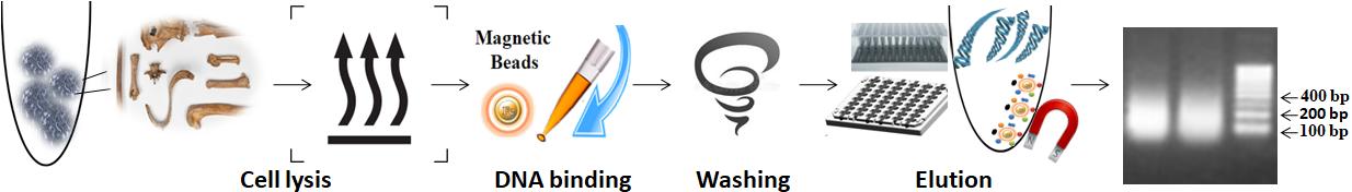從長(zhǎng)期暴露于各種環(huán)境條件下的骨骼和牙齒中提取DNA和進(jìn)行STR數(shù)據(jù)分析,已成為識(shí)別失蹤人員和指認(rèn)未知遺骸的有力工具。這類檢材由于礦化嚴(yán)重、內(nèi)源性DNA含量低、收環(huán)境,細(xì)菌等影響、死后DNA損傷,以及存在與DNA樣本共同提取的環(huán)境物質(zhì)中存在大量PCR抑制劑,因此,從受損樣本中回收DNA仍然具有挑戰(zhàn)性。盡管目前已經(jīng)有一些核酸提取技術(shù)可用于骨骼DNA提取,但用于法醫(yī)檢測(cè)的骨骼核酸提取方式仍存在一些缺陷。在實(shí)驗(yàn)過(guò)程中,DNA模板含量低、有顯著降解和普遍存在的PCR抑制成分,這些因素都會(huì)對(duì)樣本的識(shí)別造成影響,限制STR圖譜的發(fā)展。由于上述影響因素,選擇有效的DNA提取方式對(duì)于最大量減少礦物質(zhì)提取時(shí)殘留和去除聚合酶鏈反應(yīng)(PCR)抑制劑至關(guān)重要。