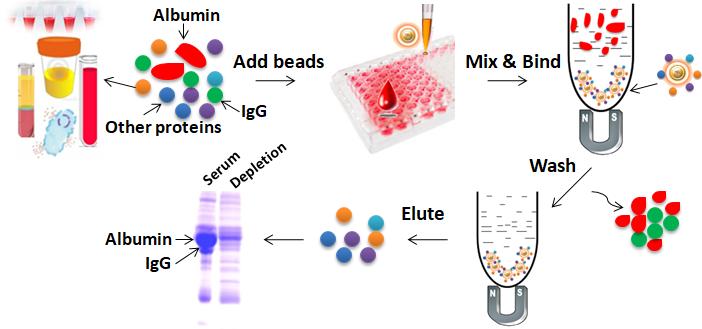目前常用的白蛋白去除方式為,親和染料配體Cibacron Blue F3GA共價(jià)鍵合到市售載體上,用于從水溶液和人血漿中吸附HSA,但這種清除方式缺乏選擇性。在免疫親和系統(tǒng)中,還會(huì)使用抗白蛋白抗體進(jìn)行白蛋白清除。使用蛋白A用于去除IgG蛋白。這些技術(shù)通常具有合理的特異性,但使用成本較高。此外,由于這些清除方式中許多都是基于瓊脂糖樹脂或其衍生柱進(jìn)行的,因此它們?cè)趯?duì)濃度較低蛋白進(jìn)行富集時(shí)過程非常耗時(shí),而且無法在短時(shí)間內(nèi)處理大量樣品,并且難以適應(yīng)自動(dòng)化系統(tǒng)。同時(shí),使用這些方法去除蛋白質(zhì)通常需要增加樣品體積來進(jìn)行實(shí)驗(yàn),因此需要額外的蛋白質(zhì)濃縮步驟。為解決上述問題,急需具有極高的效率,均勻性和吞吐量的新白蛋白和IG去除方法。