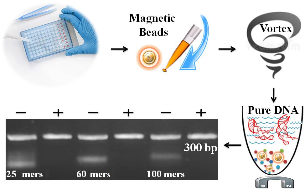 BcMag? 一步法 NGS 純化試劑盒是專門設(shè)計(jì)用于接頭連接后或PCR后DNA的快速高效純化的試劑盒。該方案不僅簡單(如圖1所示,一管一步),而且通過調(diào)整處理時間、緩沖液的pH值和洗滌劑濃度,在去除不同大小的DNA片段方面也非常靈活(表1)。將磁珠直接添加到反應(yīng)完成的PCR體系或者其他DNA反應(yīng)體系中,通過渦旋將雜質(zhì)和磁珠結(jié)合并清除(例如:多余的引物,二聚體,接頭分子,鹽,去垢劑,dNTPs,以及酶類)。渦旋過后,磁珠被磁座吸附,同時上清液中包含已純化的核酸樣品。僅需1分鐘,被純化的DNA可用于下游應(yīng)用,例如桑格測序,限制酶切,克隆,SNP檢測,或者NGS文庫準(zhǔn)備。本磁珠產(chǎn)品能夠在不到10分鐘內(nèi)同時處理96個樣品。