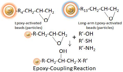 BcMag ? 環(huán)氧活化磁珠是預(yù)活化的,均勻的,表面覆蓋有高密度環(huán)氧官能團(tuán)的二氧化硅基質(zhì)的磁珠。此磁珠可以用于有效地綴合伯胺基,巰基,或含羥基基團(tuán)的配體(圖1)。它的親水性表面基團(tuán)保證了磁珠在實(shí)驗(yàn)過程中,具有極低的非特異性吸附率、且有良好的分散性,并易于在各種緩沖液中處理。環(huán)氧活化磁珠最適合大分子蛋白的結(jié)合。 BcMag?長臂環(huán)氧活化磁珠被推薦結(jié)合小肽,因?yàn)槠溟L臂(21-原子)的親水連接基團(tuán)可以減少位阻現(xiàn)象。