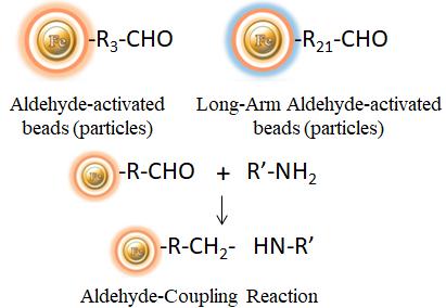 BcMag ? 醛基磁珠是均勻的二氧化硅基超順磁珠,表面連接有高密度的醛基官能團(tuán)。醛基磁珠與蛋白質(zhì)N端或賴氨酸殘基中存在的伯胺自發(fā)反應(yīng),形成中間物聚希夫堿復(fù)合物(圖1)。還原胺產(chǎn)生的固定化反應(yīng)始于醛基和胺基之間產(chǎn)生初始產(chǎn)物聚希夫堿復(fù)合物,然后通過添加氰基硼氫化鈉(NaCNBH3)將其還原為仲胺,這樣在磁珠和配體之間就可以產(chǎn)生穩(wěn)定的胺鍵。在含有20-30%DMSO或DMF的水性或有機(jī)溶劑中,生理堿性環(huán)境(pH 7.2至9)下,偶聯(lián)反應(yīng)僅需一步2至6小時(shí)的反應(yīng)過程。與抗體和正常蛋白質(zhì)的偶聯(lián)效率通常大于85%,而且每毫克磁珠可以結(jié)合15至20μg蛋白。