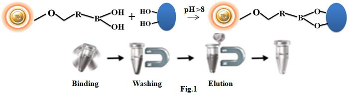 親和純化法是分離生物化合物的常用方法。其中,硼酸鹽親和層析是一種非常獨(dú)特的純化技術(shù),因?yàn)樵诨|(zhì)上連接的配體(間氨基苯基硼酸),在pH 8-9下可以特異性和可逆性地結(jié)合,含有順式二醇鄰二醇化合物的物質(zhì),并在pH 3-4條件下,在含有山梨醇的緩沖液中將其分離出去(圖1)。硼酸鹽親和樹脂可以從復(fù)雜生物樣品(如人血清)中有效富集含順二醇化合物(如醇類、核苷、核苷酸、核酸、碳水化合物、糖蛋白和酶)的有效實(shí)驗(yàn)工具。盡管目前有大量的基于硼酸鹽親和性質(zhì)的不同材質(zhì)產(chǎn)品(如純化柱)可用,但這些產(chǎn)品存在操作程序繁瑣、耗時(shí),并且無法處理非常微小體積的樣品(如癌細(xì)胞靶向和單細(xì)胞分析)等缺點(diǎn)。我們開發(fā)了一種全新的、有效的磁力親和系統(tǒng)來克服這些限制。