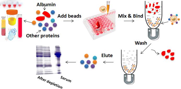 人類血清或血漿包含豐富的蛋白質組學信息,這些蛋白質經常被用于分析機體是正?;虿±頎顟B(tài)的蛋白質生物標記物。人類血清中所含有的大量的,種類眾多的蛋白質是血液蛋白質研究中最具挑戰(zhàn)性的障礙之一。大量表達的蛋白質,如白蛋白和IgG,占血清/血漿總蛋白質的70%。而蛋白質生物標記物的含量則要低得多(pg/ml)。高豐度蛋白質會隱藏需要研究的低豐度蛋白質,對一維和二維電泳、高效液相色譜和質譜分析等分析實驗造成影響。高豐度蛋白質必須有效、可重復并明確地從血液樣本中去除掉,才可以正確的檢測低豐度蛋白質。因此,在進行蛋白質組分析之前,特別是使用質譜法時,有必要從人體樣品(如血漿、血清、尿液或腦脊液)中選擇性去除白蛋白。