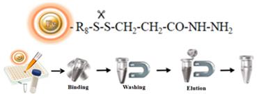 本試劑盒使用酰肼基活化磁珠和特定催化劑產(chǎn)生與糖蛋白和抗體的親和力。單克隆抗體和糖基化蛋白可以用高碘酸鹽氧化的碳水化合物基團(tuán)固定,以產(chǎn)生可重復(fù)使用的親和基質(zhì)。這種使用酰肼基團(tuán)化學(xué)固定的抗體,具有抗原結(jié)合位不會(huì)受到阻礙的有點(diǎn),和對(duì)抗體具有優(yōu)良的純化能力。在含有催化劑的,簡(jiǎn)單的非胺緩沖液中,完全偶聯(lián)只需要2至4小時(shí)??贵w和常見(jiàn)糖蛋白的偶聯(lián)效率通常大于85%,每毫克的酰肼基磁珠可以固定15μg至20μg蛋白。用穩(wěn)定的糖蛋白或抗體制備的基質(zhì)可以再生并重復(fù)使用至少五次,而不會(huì)明顯喪失結(jié)合能力。