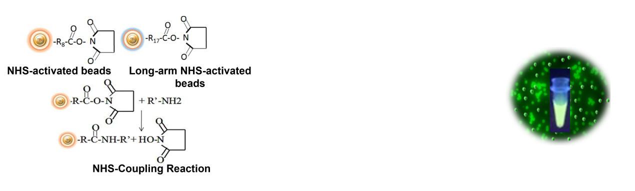 BcMag ?NHS活化鋱熒光磁珠是在表面連接高密度NHS(N-羥基琥珀酰亞胺)官能團(tuán)的時(shí)間分辨熒光(TRF)磁性微球。磁珠利用可靠的NHS酯進(jìn)行化學(xué)固定,不需要使用危險(xiǎn)化學(xué)品。而且本磁珠具有較低的非特異性結(jié)合率,并且不會(huì)造成偶聯(lián)配體的泄漏。通過形成穩(wěn)定的酰胺鍵(圖1),偶聯(lián)效率超過85%,該磁珠可以快速,有效地共價(jià)結(jié)合任何含伯胺的配體。Bioclone NHS活化磁珠反應(yīng)僅需不到一個(gè)小時(shí)(在室溫pH 7-9下為15-30分鐘,在4°C下為4小時(shí)),就可以產(chǎn)生非常穩(wěn)定的連接。