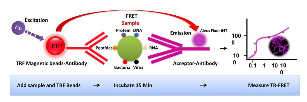 BcMag? TR-FRET測(cè)定方法與傳統(tǒng)的FRET(F?rster共振能量轉(zhuǎn)移)測(cè)定方法不同,它利用時(shí)間分辨熒光磁珠(BcMag? TR-Magnetic Beads)作為熒光供體團(tuán)。供體和受體可以是兩個(gè)蛋白質(zhì)、兩個(gè)DNA鏈、抗原、抗體或配體或其它受體。在一定的時(shí)間延遲后(通常為50至100秒),當(dāng)供體和受體分子靠近并以時(shí)間分辨方式進(jìn)行監(jiān)測(cè)時(shí),通過熒光共振能量轉(zhuǎn)移產(chǎn)生信號(hào)。在BcMag? TR-FRET測(cè)定方法中,微量的分析物可以通過時(shí)間分辨磁珠輕松地從樣品中富集,從而提高靈敏度。該測(cè)定方法消除了由樣品和塑料微孔板引起的所有熒光背景影響,以及直接激發(fā)受體所產(chǎn)生的背景影響。因此,BcMag? TR-FRET測(cè)定方法的信噪比非常高,背景值非常低。此外,該測(cè)定方法不需要清洗步驟。BcMag? TR-FRET測(cè)定方法在高通量篩選的生物分析中具有顯著的優(yōu)勢(shì),如測(cè)定靈活性、可靠性、提高測(cè)定靈敏度、更高的通量和更少的假陽性/假陰性結(jié)果。
