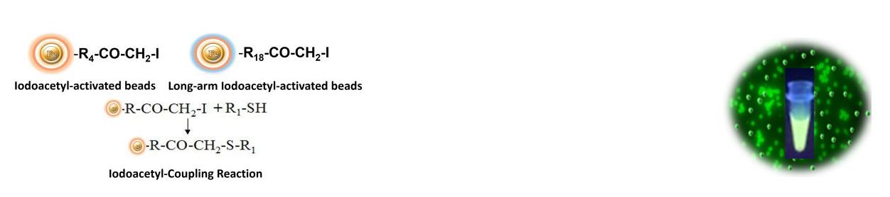 可以通過與巰基(-SH)反應(yīng)快速,高效共價固定蛋白質(zhì),多肽和其他配體,用于親和純化實驗。在堿性生理環(huán)境(pH 7.2--9)下,在含有20-30%DMSODMF的水性或有機溶劑中,碘代乙酰基活化的載體與巰基反應(yīng),產(chǎn)生穩(wěn)定的硫醚鍵。這些反應(yīng)通常在黑暗環(huán)境下進行,以防止游離碘的形成,因為游離碘可與酪氨酸,組氨酸和色氨酸殘基反應(yīng)(圖1)。親水表面可確保磁珠的非特異性吸附低,分散性好,便于在各種緩沖液中操作
