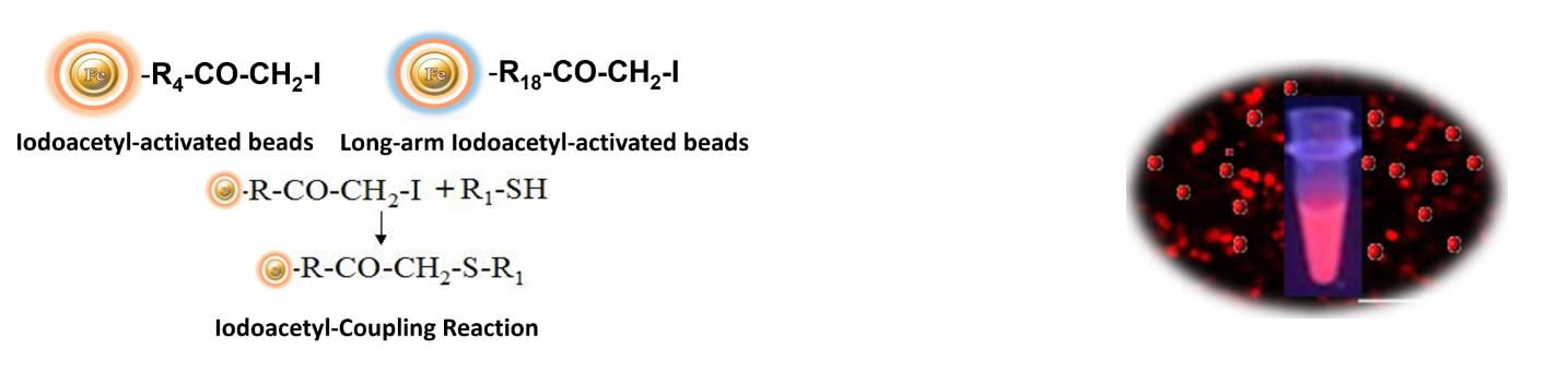 它可以通過與巰基(-SH)反應(yīng)快速,高效的共價(jià)固定蛋白質(zhì),多肽和其他配體,用于親和純化實(shí)驗(yàn)。在堿性生理環(huán)境(pH 7.2--9)下,在含有20-30%DMSO或DMF的水性或有機(jī)溶劑中,碘代乙?;罨妮d體與巰基反應(yīng),產(chǎn)生穩(wěn)定的硫醚鍵。這些反應(yīng)通常在黑暗環(huán)境下進(jìn)行,以防止游離碘的形成,因?yàn)橛坞x碘可與酪氨酸,組氨酸和色氨酸殘基反應(yīng)(圖1)。親水表面可確保磁珠的非特異性吸附低,分散性好,便于在各種緩沖液中操作。