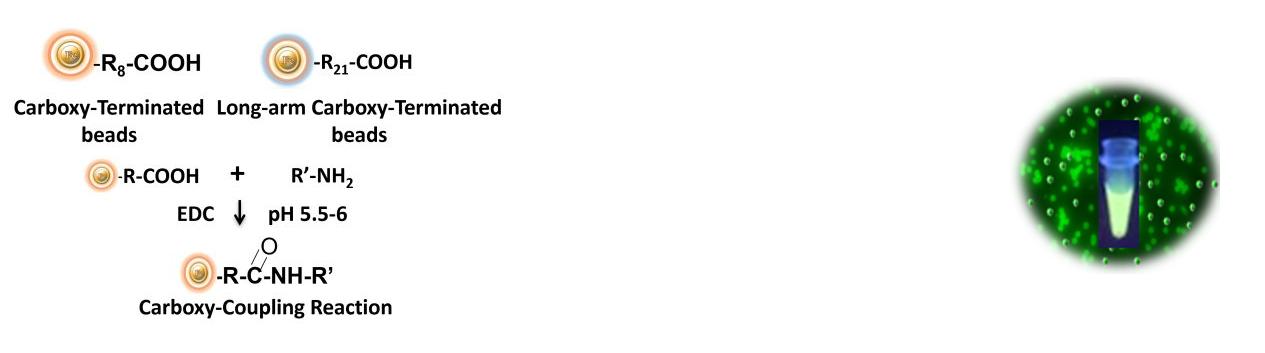 BcMag?羧基鋱熒光磁性微珠(圖1)是一種表面連接有高密度羧基功能團(tuán)的時分辨熒光磁性微球。EDC和其他碳二亞胺是零長度交聯(lián)劑,可使羧酸鹽(-COOH)直接與伯胺(-NH2)結(jié)合,而不會成為目標(biāo)分子之間最終交聯(lián)(酰胺鍵)的一部分。這些磁珠結(jié)合了預(yù)活化的羧基活性基團(tuán)、時間分辨熒光染料和磁力特性的優(yōu)勢,可以進(jìn)行非常敏感的分析。磁珠的制造采用了納米級超順磁性氧化鐵和鋱金屬作為核心,并完全封裝在高純度二氧化硅外殼中,確保不會出現(xiàn)氧化鐵和鋱金屬的溶出問題。