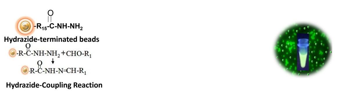 BcMag ? 酰肼基鋱熒光磁珠是在表面連接高密度酰肼官能團(tuán)的時(shí)間分辨熒光(TRF)磁性微球。酰肼反應(yīng)可有效的通過糖基化位點(diǎn)標(biāo)記,固定或結(jié)合糖蛋白,糖基化位點(diǎn)通常(與大多數(shù)多克隆抗體一樣)位于遠(yuǎn)離需要保留其功能的關(guān)鍵結(jié)合位點(diǎn)的結(jié)構(gòu)域中。以這種選擇性地與靶向分子Fc部分的重鏈結(jié)合的方式偶聯(lián)抗體,有助于Fv區(qū)域末端盡可能最好地保存抗原結(jié)合活性。在pH 5至7條件下,酰肼基的載體和化合物將與氧化碳水化合物的羰基結(jié)合,從而產(chǎn)生腙鍵。